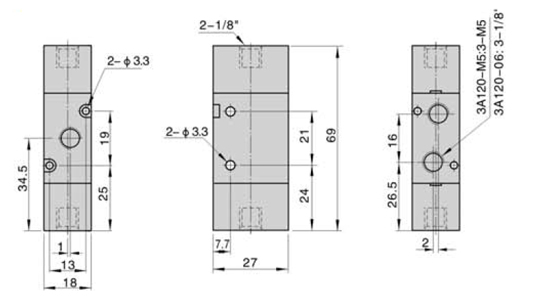 Dimensions | AirTAC วาล์วควบคุมทิศทางการไหลด้วยแรงลม ชนิด 3/2 ทาง รุ่น 3A Series