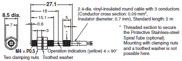| 4 dia. | 3 mm | Pre-wired Models (2 m) | PVC (oil-resistant) | NO | Brown: +V Black: Output Blue: 0 V |